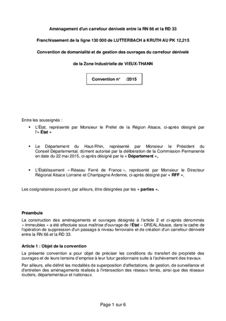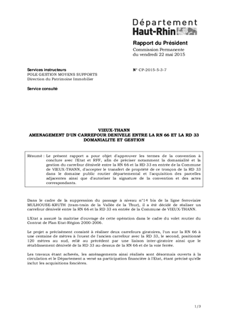 Le présent rapport a pour objet d'approuver les termes de la convention à conclure avec l'Etat et RFF, afin de préciser notamment la domanialité et la gestion du carrefour dénivelé entre la RN 66 et la RD 33 en entrée de la Commune de VIEUX-THANN, d'accepter le transfert de propriété de ce tronçon de la RD 33 dans le domaine public routier départemental et l'acquisition des parcelles adjacentes ainsi que d'autoriser la signature de la convention et des actes correspondants.