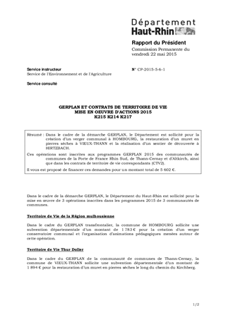 Dans le cadre de la démarche GERPLAN, le Département est sollicité pour la création d’un verger communal à HOMBOURG, la restauration d’un muret en pierres sèches à VIEUX-THANN et la réalisation d’un sentier de découverte à HIRTZBACH. Ces opérations sont inscrites aux programmes GERPLAN 2015 des communautés de communes de la Porte de France Rhin Sud, de Thann-Cernay et d’Altkirch, ainsi que dans les contrats de territoire de vie correspondants (CTV2). Il vous est proposé de financer ces demandes pour un montant total de 5 602 €.