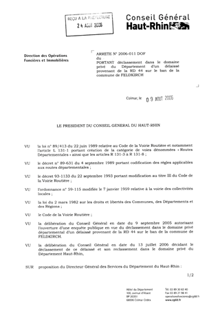 portant déclassement dans le domaine privé du Département d'un délaissé provenant de la RD 44 sur le ban de la commune de Feldkirch Resumé Pièces jointes ARRETE Assemblée : Non défini Date : 09/08/2006 Rapporteur : Non défini Collectivité : Conseil départemental du Haut-Rhin Direction : Non défini Service : Service du Patrimoine et du droit des Sols Domaine : Déclassement de voirie Commission :