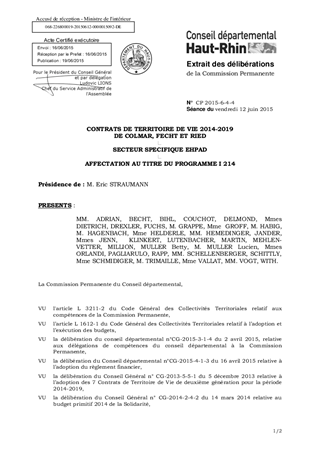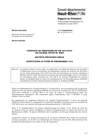 CONTRATS DE TERRITOIRE DE VIE 2014-2019 DE COLMAR, FECHT ET RIED SECTEUR SPECIFIQUE EHPAD AFFECTATION AU TITRE DU PROGRAMME I 214