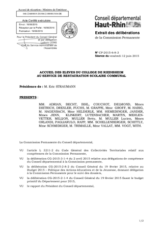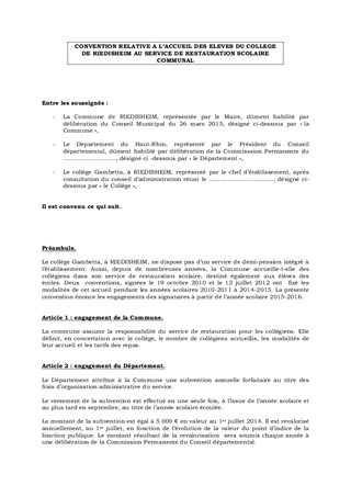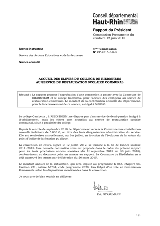 Le rapport propose l'approbation d'une convention à passer avec la Commune de RIEDISHEIM et le collège Gambetta, pour l'accueil des collégiens au service de restauration communal. Le montant de la contribution annuelle du Département, pour le fonctionnement de ce service, est égal à 5 000 €.