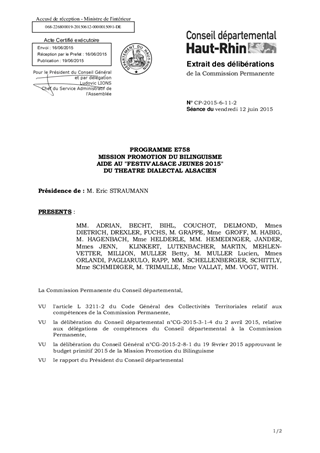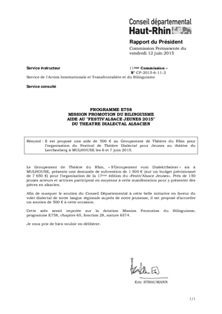 PROGRAMME E758 MISSION PROMOTION DU BILINGUISME AIDE AU "FESTIV'ALSACE JEUNES 2015" DU THEATRE DIALECTAL ALSACIEN