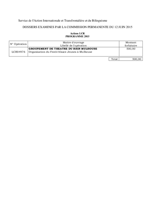 Il est proposé une aide de 500 € au Groupement de Théâtre du Rhin pour l’organisation du Festival de Théâtre Dialectal pour Jeunes au théâtre du Lerchenberg à MULHOUSE les 6 et 7 juin 2015.