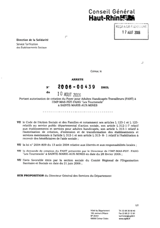 portant autorisation de création du Foyer pour Adultes Handicapés Travailleurs à l'IMP-MAS-FDT-FAHG "Les Tournesols" à Sainte Marie aux Mines Resumé Pièces jointes ARRETE Assemblée : Non défini Date : 10/08/2006 Rapporteur : Non défini Collectivité : Conseil départemental du Haut-Rhin Direction : Non défini Service : Service de la Tarification des Etablissements Domaine : Autres (non classés) Commission :