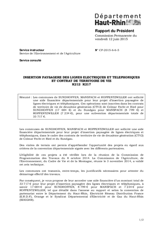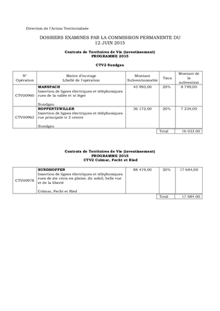 Les communes de SUNDHOFFEN, MANSPACH et ROPPENTZWILLER ont sollicité une aide financière départementale pour leur projet d’insertion paysagère de lignes électriques et téléphoniques. Ces opérations sont inscrites dans les contrats de territoire de vie de deuxième génération (CTV2) de Colmar Fecht et Ried pour SUNDHOFFEN (17 684 €) et du Sundgau pour MANSPACH (8 799 €) et ROPPENTZWILLER (7 234 €), pour une subvention départementale totale de 33 717 €.