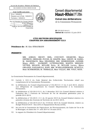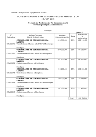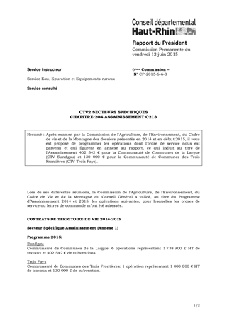 Après examen par la Commission de l'Agriculture, de l'Environnement, du Cadre de vie et de la Montagne des dossiers présentés en 2014 et en début 2015, il vous est proposé de programmer les opérations dont l'ordre de service nous est parvenu et qui figurent en annexe au rapport, ce qui induit au titre de l'Assainissement 402 542 € pour la Communauté de Communes de la Largue (CTV Sundgau) et 130 000 € pour la Communauté de Communes des Trois Frontières (CTV Trois Pays).