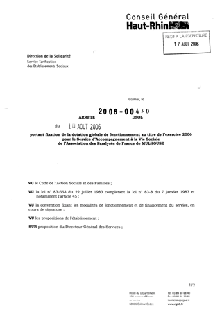 portant fixation de la dotation globale de fonctionnement au titre de l'exercice 2006 pour le Service d'Accompagnement à la Vie Sociale de l'Association des Paralysés de France de Mulhouse Resumé Pièces jointes ARRETE Assemblée : Non défini Date : 10/08/2006 Rapporteur : Non défini Collectivité : Conseil départemental du Haut-Rhin Direction : Non défini Service : Service de la Tarification des Etablissements Domaine : Dotations financières Commission :
