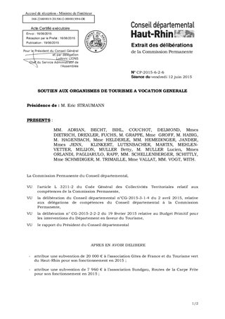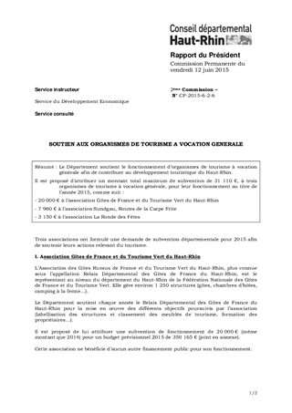 Le Département soutient le fonctionnement d’organismes de tourisme à vocation générale afin de contribuer au développement touristique du Haut-Rhin. Il est proposé d’attribuer un montant total maximum de subvention de 31 110 €, à trois organismes de tourisme à vocation générale, pour leur fonctionnement au titre de l’année 2015, comme suit : - 20 000 € à l’association Gîtes de France et du Tourisme Vert du Haut-Rhin - 7 960 € à l’association Sundgau, Routes de la Carpe Frite - 3 150 € à l’association La Ronde des Fêtes