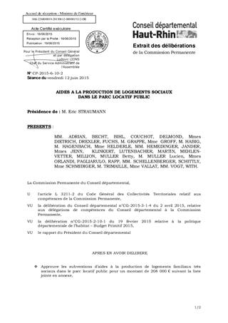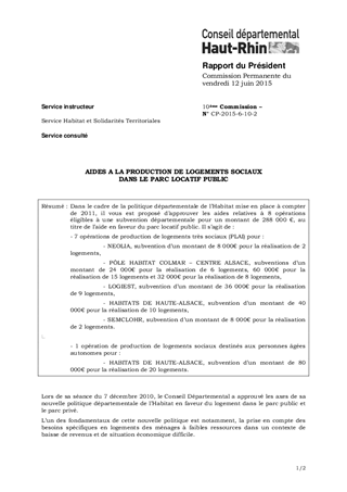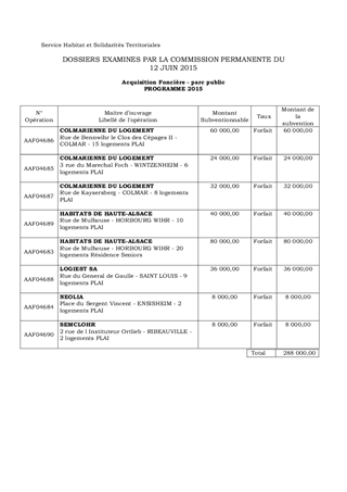 Dans le cadre de la politique départementale de l’Habitat mise en place à compter de 2011, il vous est proposé d’approuver les aides relatives à 8 opérations éligibles à une subvention départementale pour un montant de 288 000 €, au titre de l’aide en faveur du parc locatif public. Il s’agit de : - 7 opérations de production de logements très sociaux (PLAI) pour : - NEOLIA, subvention d’un montant de 8 000€ pour la réalisation de 2 logements, - PÔLE HABITAT COLMAR – CENTRE ALSACE, subventions d’un montant de 24 000€ pour la réalisation de 6 logements, 60 000€ pour la réalisation de 15 logements et 32 000€ pour la réalisation de 8 logements, - LOGIEST, subvention d’un montant de 36 000€ pour la réalisation de 9 logements, - HABITATS DE HAUTE-ALSACE, subvention d’un montant de 40 000€ pour la réalisation de 10 logements, - SEMCLOHR, subvention d’un montant de 8 000€ pour la réalisation de 2 logements. - 1 opération de production de logements sociaux destinés aux personnes âgées autonomes pour : - HABITATS DE HAUTE-ALSACE, subvention d’un montant de 80 000€ pour la réalisation de 20 logements.
