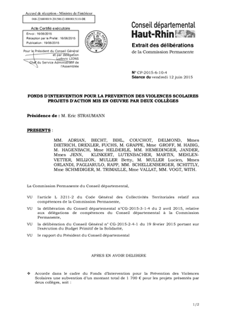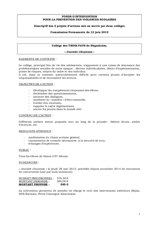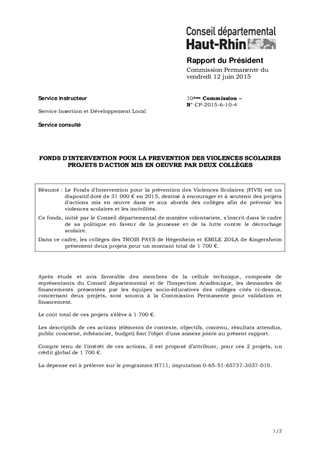 Le Fonds d'Intervention pour la prévention des Violences Scolaires (FIVS) est un dispositif doté de 31 000 € en 2015, destiné à encourager et à soutenir des projets d'actions mis en œuvre dans et aux abords des collèges afin de prévenir les violences scolaires et les incivilités. Ce fonds, initié par le Conseil départemental de manière volontariste, s’inscrit dans le cadre de sa politique en faveur de la jeunesse et de la lutte contre le décrochage scolaire. Dans ce cadre, les collèges des TROIS PAYS de Hégenheim et EMILE ZOLA de Kingersheim présentent deux projets pour un montant total de 1 700 €.