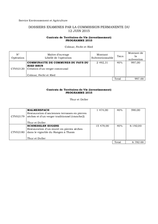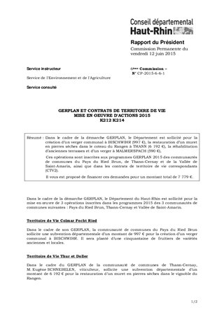 Dans le cadre de la démarche GERPLAN, le Département est sollicité pour la création d’un verger communal à BISCHWIHR (997 €), la restauration d’un muret en pierres sèches dans le coteau du Rangen à THANN (6 192 €), la réhabilitation d’anciennes terrasses et d’un verger à MALMERSPACH (590 €), Ces opérations sont inscrites aux programmes GERPLAN 2015 des communautés de communes du Pays du Ried Brun, de Thann-Cernay et de la Vallée de Saint-Amarin, ainsi que dans les contrats de territoire de vie correspondants (CTV2). Il vous est proposé de financer ces demandes pour un montant total de 7 779 €.