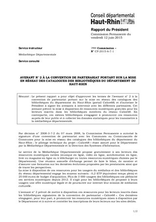 Le présent rapport a pour objet d’approuver les termes de l’avenant n° 2 à la convention de partenariat portant sur la mise en réseau des catalogues des bibliothèques du département du Haut-Rhin (portail Calice68) et d’autoriser le Président à signer les avenants à intervenir avec les différents partenaires. Cet avenant prévoit la mise à disposition de ressources numériques gratuites pour les lecteurs inscrits dans les bibliothèques membres du réseau Calice68. En contrepartie, ces mêmes bibliothèques s'engagent à promouvoir ces ressources auprès de leur public et à collecter les données statistiques pour les transmettre à la médiathèque départementale.