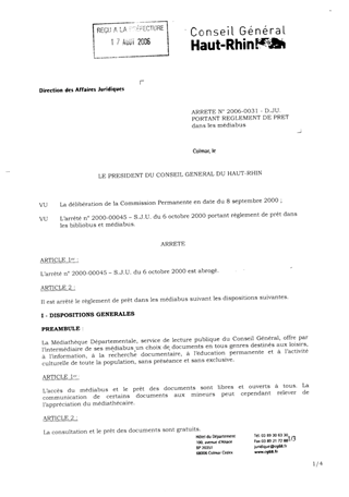 portant réglement de prêt dans les médiabus Resumé Pièces jointes ARRETE Assemblée : Non défini Date : 11/08/2006 Rapporteur : Non défini Collectivité : Conseil départemental du Haut-Rhin Direction : Non défini Service : Service Juridique Domaine : Organisation Interne Commission :
