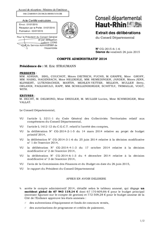 Le Compte administratif de l’exercice 2014 fait apparaître au budget principal (mouvements réels et d’ordre) des dépenses à hauteur de 918,94 M€ et des ressources d’un montant de 986,11 €, pour obtenir un résultat excédentaire cumulé de 67,17 M€, dont 10,8 M€ correspondant au résultat de la seule année 2014. Le volume des dépenses de fonctionnement (602,43 M€) est en l’occurrence en augmentation de 4,7 %, en raison, notamment, d’un accroissement des dépenses sociales de 18,8 M€. Les recettes de fonctionnement s’élèvent à 672,21 M€, contre 650,24 M€ en 2013, et affichent une hausse de 3,4 %. L’exercice 2014 est particulièrement marqué par la ponction de 6 M€ opérée sur la Dotation Globale de Fonctionnement (DGF) au titre de notre participation au déficit public, mouvement appelé encore à s’accélérer avec un prélèvement de 14 M€ supplémentaires en 2015, 2016 et 2017. En 2014, cette diminution est quelque peu atténuée par certaines mesures nouvelles issues de la loi de finances pour 2014 d’un montant global estimé de 20,4 M€. L’épargne brute, correspondant au solde entre les recettes et les dépenses de fonctionnement, baisse de 4,8 M€ en passant de 74,6 M€ à 69,8 M€ en 2014. Du côté des investissements, le Département a maintenu ses dépenses opérationnelles à hauteur de 98,6 M€ (hors mouvements financiers), ce qui correspond à un effort significatif en faveur de l’économie et de l’emploi dans notre territoire. Le recours à l’emprunt a été réduit à 50 M€, contre 60 M€ en 2013. Le volume total des recettes d’investissement s’est élevé à 122,31 M€.