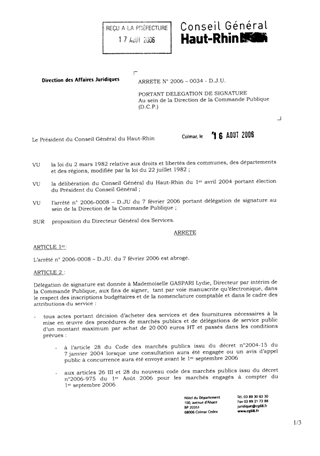 portant délégation de signature au sein de la Direction de la Commande Publique Resumé Pièces jointes ARRETE Assemblée : Non défini Date : 16/08/2006 Rapporteur : Non défini Collectivité : Conseil départemental du Haut-Rhin Direction : Non défini Service : Service Juridique Domaine : Organisation Interne Commission :