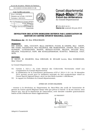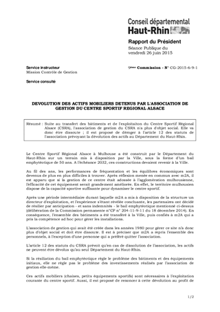 Suite au transfert des bâtiments et de l'exploitaiton du Centre Sportif Régional Alsace (CSRA), l'association de gestion du CSRA n'a plus d'objet social. Elle va donc être dissoute ; il est proposé de déroger à l'article 12 des statuts de l'association prévoyant la dévolution des actifs au Département du Haut-Rhin.