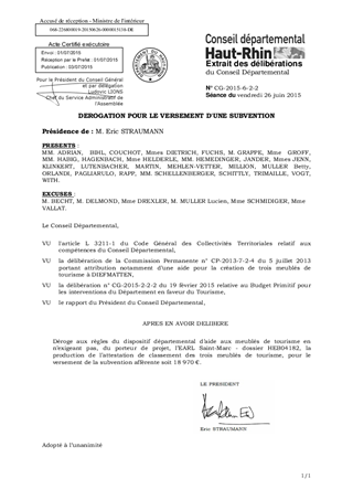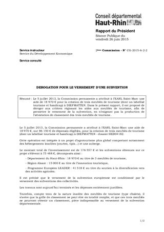 Le 5 juillet 2013, la Commission permanente a attribué à l’EARL Saint-Marc une aide de 18 970 € pour la création de trois meublés de tourisme (dont un labellisé tourisme et handicap) à DIEFMATTEN. Dans le présent rapport, il est proposé de déroger aux critères régissant les aides aux meublés de tourisme, afin de permettre le versement de la subvention, en n’exigeant pas la production de l’attestation de classement des trois meublés de tourisme.