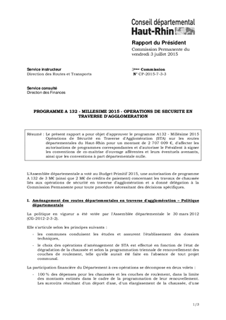Le présent rapport a pour objet d'approuver le programme A132 - Millésime 2015 Opérations de Sécurité en Traverse d'Agglomération (STA) sur les routes départementales du Haut-Rhin pour un montant de 2 707 009 €, d'affecter les autorisations de programmes correspondantes et d'autoriser le Président à signer les conventions de co-maîtrise d'ouvrage afférentes et leurs éventuels avenants, ainsi que les conventions à part départementale nulle.