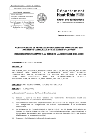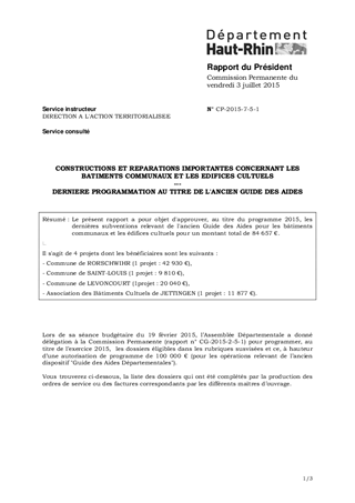 Le présent rapport a pour objet d'approuver, au titre du programme 2015, les dernières subventions relevant de l'ancien Guide des Aides pour les bâtiments communaux et les édifices cultuels pour un montant total de 84 657 €. Il s'agit de 4 projets dont les bénéficiaires sont les suivants : - Commune de RORSCHWIHR (1 projet : 42 930 €), - Commune de SAINT-LOUIS (1 projet : 9 810 €), - Commune de LEVONCOURT (1projet : 20 040 €), - Association des Bâtiments Cultuels de JETTINGEN (1 projet : 11 877 €).
