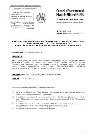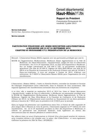 PARTICIPATION FINANCIERE AUX 3EMES RENCONTRES AQUATERRITORIAL A MULHOUSE LES 23 ET 24 SEPTEMBRE 2015 CHAPITRE 65 PROGRAMME C711 PRESERVATION DE LA RESSOURCE