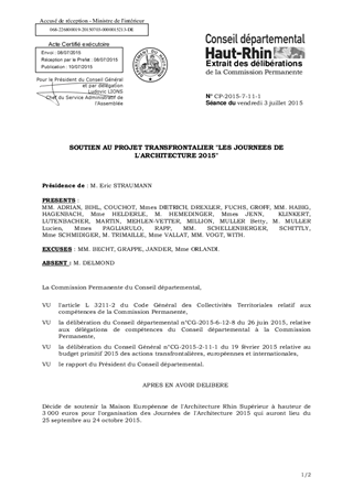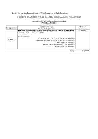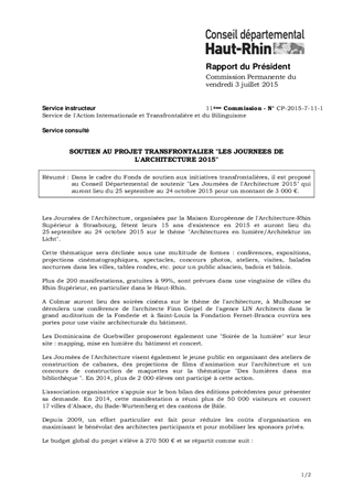 Dans le cadre du Fonds de soutien aux initiatives transfrontalières, il est proposé au Conseil Départemental de soutenir "Les Journées de l'Architecture 2015" qui auront lieu du 25 septembre au 24 octobre 2015 pour un montant de 3 000 €.