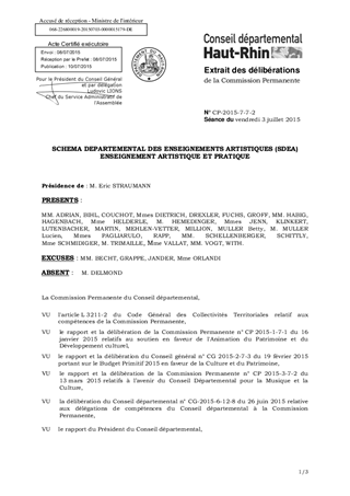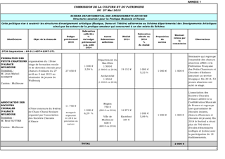 Au titre de sa politique culturelle, le Conseil départemental du Haut-Rhin a adopté différents dispositifs dont le soutien à l'enseignement artistique et pratique (Schéma Départemental des Enseignements Artistiques) qui concerne les structures œuvrant pour la pratique musicale et vocale et celles concourant à la mise en œuvre du Schéma. Il est proposé, dans le présent rapport : - d'attribuer et d'autoriser le versement de subventions pour un montant total de 2 000 € à 2 associations œuvrant pour la pratique musicale et vocale ; - d'attribuer et d'autoriser le versement d’une subvention à 6 structures concourant à la mise en œuvre du Schéma Départemental des Enseignements Artistiques (SDEA), pour un montant total de 581 000 €, répartis comme suit : . 150 000 € au Conseil Départemental pour la Musique et la Culture de Guebwiller (CDMC) . 50 000 € au Groupement d'Employeurs de l'Enseignement Musical (GEEM) . 20 000 € à Mission Voix Alsace (MVA) et aux Villes de Colmar, Mulhouse et Saint-Louis pour le fonctionnement de leur conservatoire : . 150 000 € pour Colmar . 141 000 € pour Mulhouse . 70 000 € pour Saint-Louis - de valider et de m'autoriser à signer la convention annuelle de financement pour 2015 avec le GEEM et l’avenant n° 2 à la convention de financement avec le CDMC du 29 janvier 2015 ; - de prendre acte des informations relatives aux comités de suivi relatant le bilan de l'année 2014 et les perspectives pour 2015, dans le cadre des conventions de partenariat conclues au titre de la politique de l'Enseignement Artistique et Pratique avec les 3 Conservatoires et les 9 Ecoles Centre.