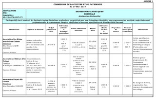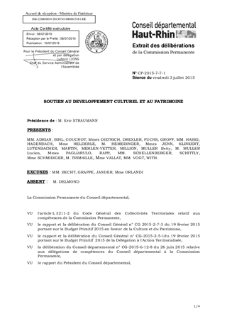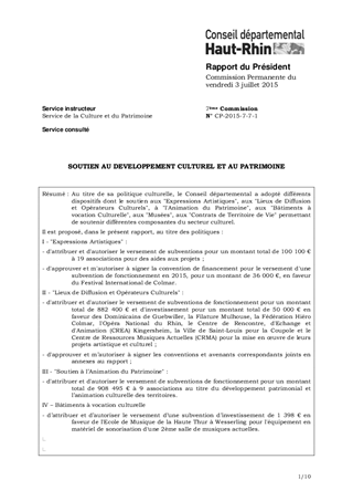 Au titre de sa politique culturelle, le Conseil départemental a adopté différents dispositifs dont le soutien aux "Expressions Artistiques", aux "Lieux de Diffusion et Opérateurs Culturels", à "l'Animation du Patrimoine", aux "Bâtiments à vocation Culturelle", aux "Musées", aux "Contrats de Territoire de Vie" permettant de soutenir différentes composantes du secteur culturel. Il est proposé, dans le présent rapport, au titre des politiques : I - "Expressions Artistiques" : - d'attribuer et d'autoriser le versement de subventions pour un montant total de 100 100 € à 19 associations pour des aides aux projets ; - d'approuver et m'autoriser à signer la convention de financement pour le versement d'une subvention de fonctionnement en 2015, pour un montant de 36 000 €, en faveur du Festival International de Colmar. II - "Lieux de Diffusion et Opérateurs Culturels" : - d'attribuer et d'autoriser le versement de subventions de fonctionnement pour un montant total de 882 400 € et d'investissement pour un montant total de 50 000 € en faveur des Dominicains de Guebwiller, la Filature Mulhouse, la Fédération Hiéro Colmar, l'Opéra National du Rhin, le Centre de Rencontre, d'Echange et d'Animation (CREA) Kingersheim, la Ville de Saint-Louis pour la Coupole et le Centre de Ressources Musiques Actuelles (CRMA) pour la mise en œuvre de leurs projets artistique et culturel ; - d'approuver et m’autoriser à signer les conventions et avenants correspondants joints en annexes au rapport ; III - "Soutien à l’Animation du Patrimoine" : - d'attribuer et d'autoriser le versement de subventions de fonctionnement pour un montant total de 908 495 € à 9 associations au titre du développement patrimonial et l’animation culturelle des territoires. IV – Bâtiments à vocation culturelle - d’attribuer et d’autoriser le versement d’une subvention d’investissement de 1 398 € en faveur de l'Ecole de Musique de la Haute Thur à Wesserling pour l'équipement en matériel de sonorisation d'une 2ème salle de musiques actuelles. V – "Musées " - d'attribuer et d'autoriser le versement de deux subventions d’investissement pour un montant total de 350 000 € en faveur de l’Association de l’Ecomusée d’Alsace et l’Association pour la Gestion et l’Animation du Parc Textile de Wesserling. VI – "Contrat de Territoire de Vie du Sundgau 2014-2019" - d'attribuer et d'autoriser le versement d’une subvention d’investissement d’un montant de 10 000 € en faveur de la SCI Daniel Munck pour la restauration d’une maison d’habitation du XVIIème siècle située 6 rue de la Vieille Porte à Altkirch.