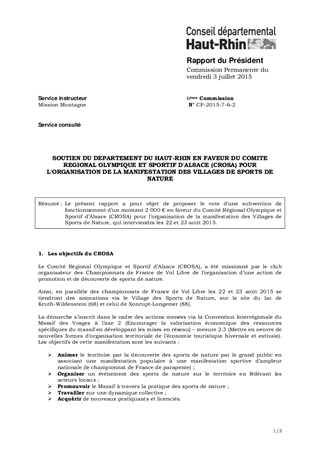 Le présent rapport a pour objet de proposer le vote d'une subvention de fonctionnement d’un montant 2 000 € en faveur du Comité Régional Olympique et Sportif d’Alsace (CROSA) pour l’organisation de la manifestation des Villages de Sports de Nature, qui interviendra les 22 et 23 août 2015.