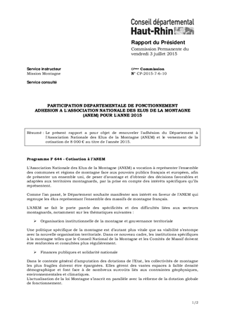 Le présent rapport a pour objet de renouveler l'adhésion du Département à l'Association Nationale des Elus de la Montagne (ANEM) et le versement de la cotisation de 8 000 € au titre de l'année 2015.
