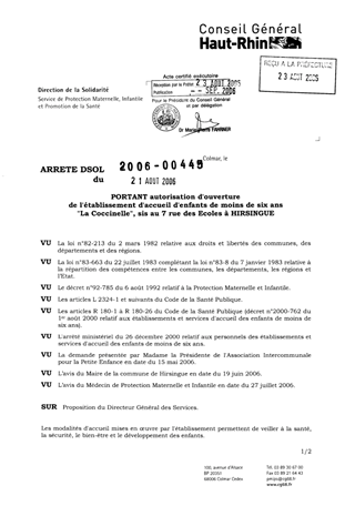 portant autorisation d'ouverture de l'établissement d'accueil d'enfants de moins de six ans "La Coccinelle", sis au 7 rue des Ecoles à Hirsingue Resumé Pièces jointes ARRETE Assemblée : Non défini Date : 21/08/2006 Rapporteur : Non défini Collectivité : Conseil départemental du Haut-Rhin Direction : Non défini Service : Service de Protection Maternelle et Infantile Domaine : Accueil d'enfants Commission :