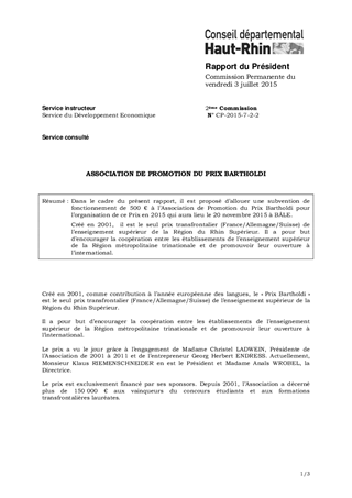 Dans le cadre du présent rapport, il est proposé d’allouer une subvention de fonctionnement de 500 € à l’Association de Promotion du Prix Bartholdi pour l’organisation de ce Prix en 2015 qui aura lieu le 20 novembre 2015 à BÂLE. Créé en 2001, il est le seul prix transfrontalier (France/Allemagne/Suisse) de l’enseignement supérieur de la Région du Rhin Supérieur. Il a pour but d’encourager la coopération entre les établissements de l’enseignement supérieur de la Région métropolitaine trinationale et de promouvoir leur ouverture à l’international.