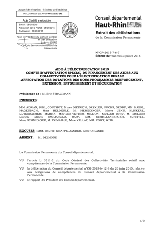 AIDE À L'ÉLECTRIFICATION 2015 COMPTE D'AFFECTATION SPECIAL DU FINANCEMENT DES AIDES AUX COLLECTIVITÉS POUR L'ÉLECTRIFICATION RURALE AFFECTATION DES DOTATIONS DES SOUS-PROGRAMMES RENFORCEMENT, EXTENSION, ENFOUISSEMENT ET SÉCURISATION