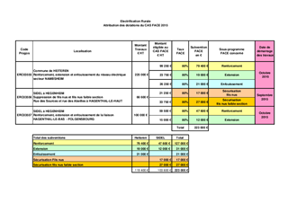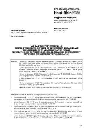 Ce rapport propose d’allouer les dotations du Compte d’Affectation Spécial (CAS) du Financement des Aides aux Collectivités pour l’Electrification Rurale (FACE) 2015 de la manière suivante : - Sous-programme FACE "Renforcement" à la Commune de HEITEREN et au Syndicat Intercommunal d’Energie Electrique (SIDEL) à HEGENHEIM pour respectivement 79 400 € et 47 600 €, - Sous-programme FACE "Extension" à la Commune de HEITEREN et au SIDEL pour respectivement 19 000 € et 12 000 €, - Sous-programme FACE "Enfouissement" à la Commune de HEITEREN pour 21 000 €, - Sous-programmes FACE "Sécurisation fils nus" et "Sécurisation fils nus faible section" au SIDEL pour 44 000 €. Ces affectations n’ont pas d’incidence sur le Budget du Département.