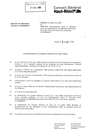 portant déclassement dans le domaine privé du Département de délaissés provenant de la RD 419 sur le ban de la commune d'Altkirch Resumé Pièces jointes ARRETE Assemblée : Non défini Date : 24/08/2006 Rapporteur : Non défini Collectivité : Conseil départemental du Haut-Rhin Direction : Non défini Service : Service du Patrimoine et du droit des Sols Domaine : Déclassement de voirie Commission :
