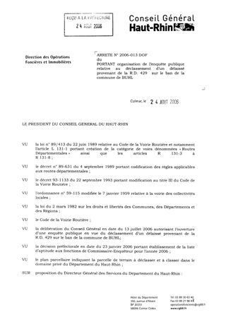 portant organisation de l'enquête publique relative au déclassement d'un délaissé provenant de la RD 429 sur le ban de la commune de Buhl Resumé Pièces jointes ARRETE Assemblée : Non défini Date : 24/08/2006 Rapporteur : Non défini Collectivité : Conseil départemental du Haut-Rhin Direction : Non défini Service : Service du Patrimoine et du droit des Sols Domaine : Déclassement de voirie Commission :