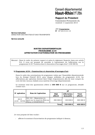 Dans le cadre du présent rapport et selon le règlement financier dans son article 9.6, il vous est proposé de procéder à l'ajustement de l'affectation sur le programme A134 "Construction et rénovation d'ouvrages d'art" (100 000 €).