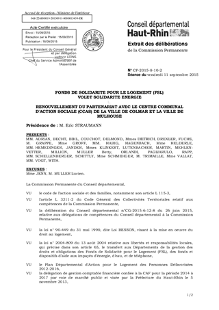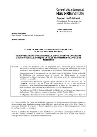 FONDS DE SOLIDARITE POUR LE LOGEMENT (FSL) VOLET SOLIDARITE ENERGIE RENOUVELLEMENT DU PARTENARIAT AVEC LE CENTRE COMMUNAL D'ACTION SOCIALE (CCAS) DE LA VILLE DE COLMAR ET LA VILLE DE MULHOUSE