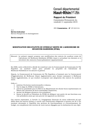 Le présent rapport propose une modification des statuts du syndicat mixte de l'aérodrome de Mulhouse-Habsheim (SYMA) visant à actualiser ces derniers et à introduire des mesures d'assouplissement organisationnel.