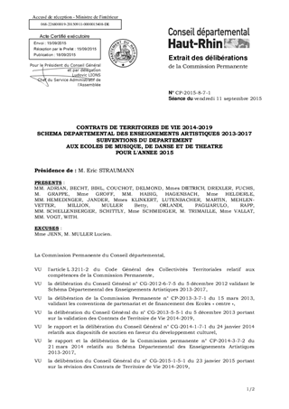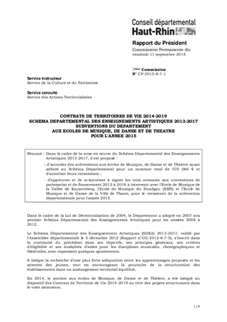 CONTRATS DE TERRITOIRES DE VIE 2014-2019 SCHEMA DEPARTEMENTAL DES ENSEIGNEMENTS ARTISTIQUES 2013-2017 SUBVENTIONS DU DEPARTEMENT AUX ECOLES DE MUSIQUE, DE DANSE ET DE THEATRE POUR L'ANNEE 2015