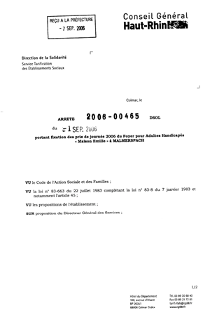 portant fixation des prix de journée 2006 du foyer pour adultes handicapés "Maison Emilie" à MALMERSPACH. Resumé Pièces jointes ARRETE Assemblée : Non défini Date : 01/09/2006 Rapporteur : Non défini Collectivité : Conseil départemental du Haut-Rhin Direction : Non défini Service : Service de la Tarification des Etablissements Domaine : Organisation Interne Commission :