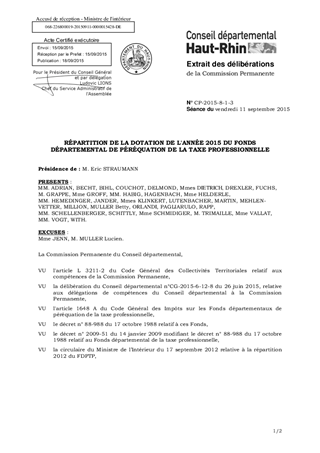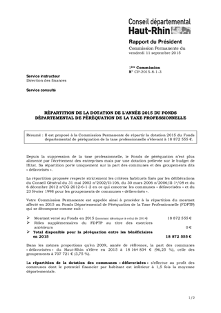 RÉPARTITION DE LA DOTATION DE L'ANNÉE 2015 DU FONDS DÉPARTEMENTAL DE PÉRÉQUATION DE LA TAXE PROFESSIONNELLE