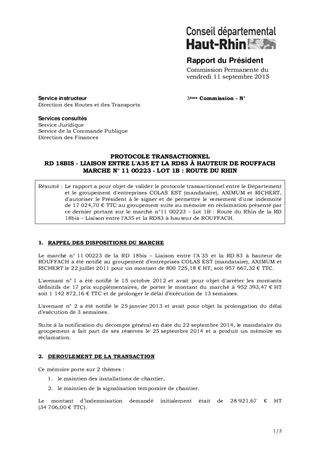 Le rapport a pour objet de valider le protocole transactionnel entre le Département et le groupement d'entreprises COLAS EST (mandataire), AXIMUM et RICHERT, d'autoriser le Président à le signer et de permettre le versement d'une indemnité de 17 024,70 € TTC au groupement suite au mémoire en réclamation présenté par ce dernier portant sur le marché n°11 00223 – Lot 1B : Route du Rhin de la RD 18bis – Liaison entre l’A35 et la RD83 à hauteur de ROUFFACH.