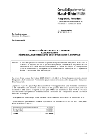 Il vous est proposé d'accorder la garantie départementale d'emprunt à la SA HLM LOGIEST à hauteur de 100 % pour un éco-prêt de 165 000 € et un prêt PAM d’un montant de 103 360 € à souscrire auprès de la Caisse des dépôts et consignations pour le financement d'une opération de réhabilitation thermique de 15 logements situés 12 avenue de Bâle à Huningue.