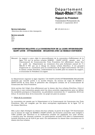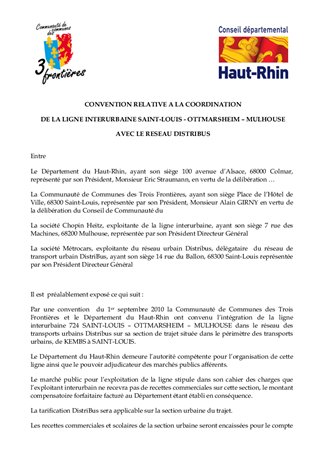Le rapport a pour objet le renouvellement de la convention d’affrètement de la ligne 724 sur la section urbaine KEMBS – SAINT LOUIS passée avec la Communauté de Communes des Trois Frontières. Cet affrètement donne lieu au profit du Département au versement d’un prix forfaitaire annuel de 71 880,48 € TTC par an à charge du réseau urbain Distribus. Il est proposé d’approuver la convention pour la coordination de la ligne interurbaine 724 avec le réseau urbain Distribus, conformément au modèle joint en annexe du rapport, et d’autoriser le Président à la signer