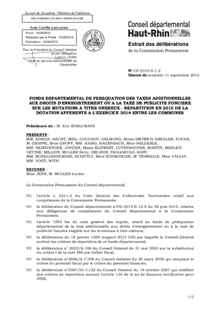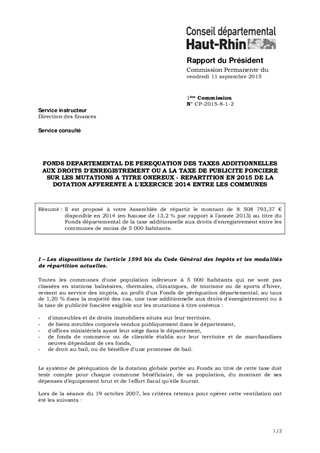 FONDS DEPARTEMENTAL DE PEREQUATION DES TAXES ADDITIONNELLES AUX DROITS D'ENREGISTREMENT OU A LA TAXE DE PUBLICITE FONCIERE SUR LES MUTATIONS A TITRE ONEREUX - REPARTITION EN 2015 DE LA DOTATION AFFERENTE A L'EXERCICE 2014 ENTRE LES COMMUNES