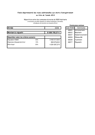 Il est proposé à votre Assemblée de répartir le montant de 8 508 793,37 € disponible en 2014 (en hausse de 13,2 % par rapport à l’année 2013) au titre du Fonds départemental de la taxe additionnelle aux droits d'enregistrement entre les communes de moins de 5 000 habitants.
