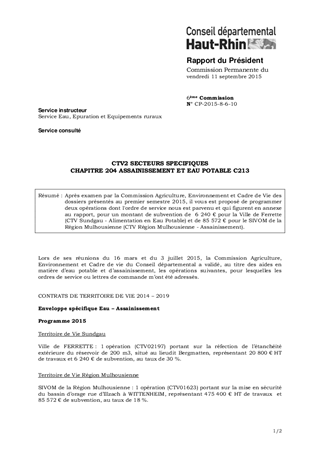 Après examen par la Commission Agriculture, Environnement et Cadre de Vie des dossiers présentés au premier semestre 2015, il vous est proposé de programmer deux opérations dont l'ordre de service nous est parvenu et qui figurent en annexe au rapport, pour un montant de subvention de 6 240 € pour la Ville de Ferrette (CTV Sundgau - Alimentation en Eau Potable) et de 85 572 € pour le SIVOM de la Région Mulhousienne (CTV Région Mulhousienne - Assainissement).