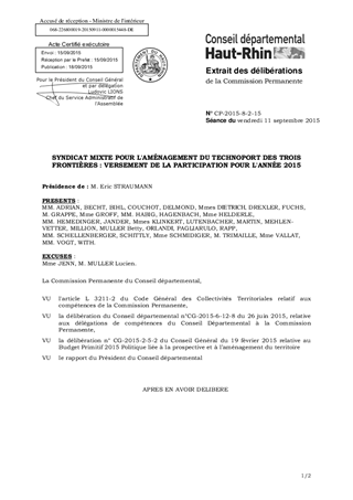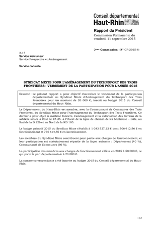 Le présent rapport a pour objectif d'autoriser le versement de la participation départementale au Syndicat Mixte d'Aménagement du Technoport des Trois Frontières pour un montant de 20 000 €, inscrit au budget 2015 du Conseil départemental du Haut-Rhin.