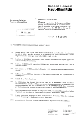 portant organisation de l'enquête publique relative au déclassement et au reclassement dans le domaine privé départemental d'un délaissé provenant des RD 39 et 468 sur le ban de la commune de BANTZENHEIM. Resumé Pièces jointes ARRETE Assemblée : Non défini Date : 18/09/2006 Rapporteur : Non défini Collectivité : Conseil départemental du Haut-Rhin Direction : Non défini Service : Service du Patrimoine et du droit des Sols Domaine : Déclassement de voirie Commission :