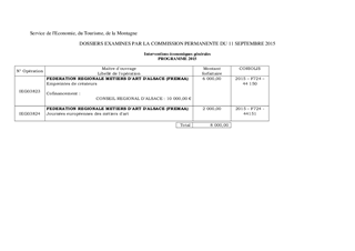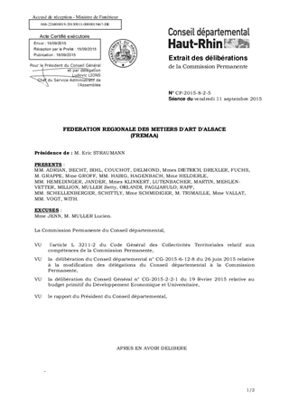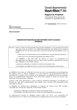 Dans le cadre des Interventions Economiques Générales, il est proposé d'accorder une aide totale de 8 000 € à la Fédération Régionale des Métiers d'Art d'Alsace (FREMAA) au titre de 2015 pour deux actions de promotion des Métiers d’Art, à savoir : - 6 000 € pour la 10ème édition de la manifestation « Empreintes de Créateurs » - 2 000 € pour les Journées Européennes des Métiers d’Art. La FREMAA a été créée afin de mettre en œuvre un programme de développement des Métiers d'Art en Alsace. Elle souhaite consolider ses actions pour répondre à une double volonté : - représenter, défendre et valoriser le secteur des métiers d’art, - accompagner ses adhérents pour accroître leur développement économique.